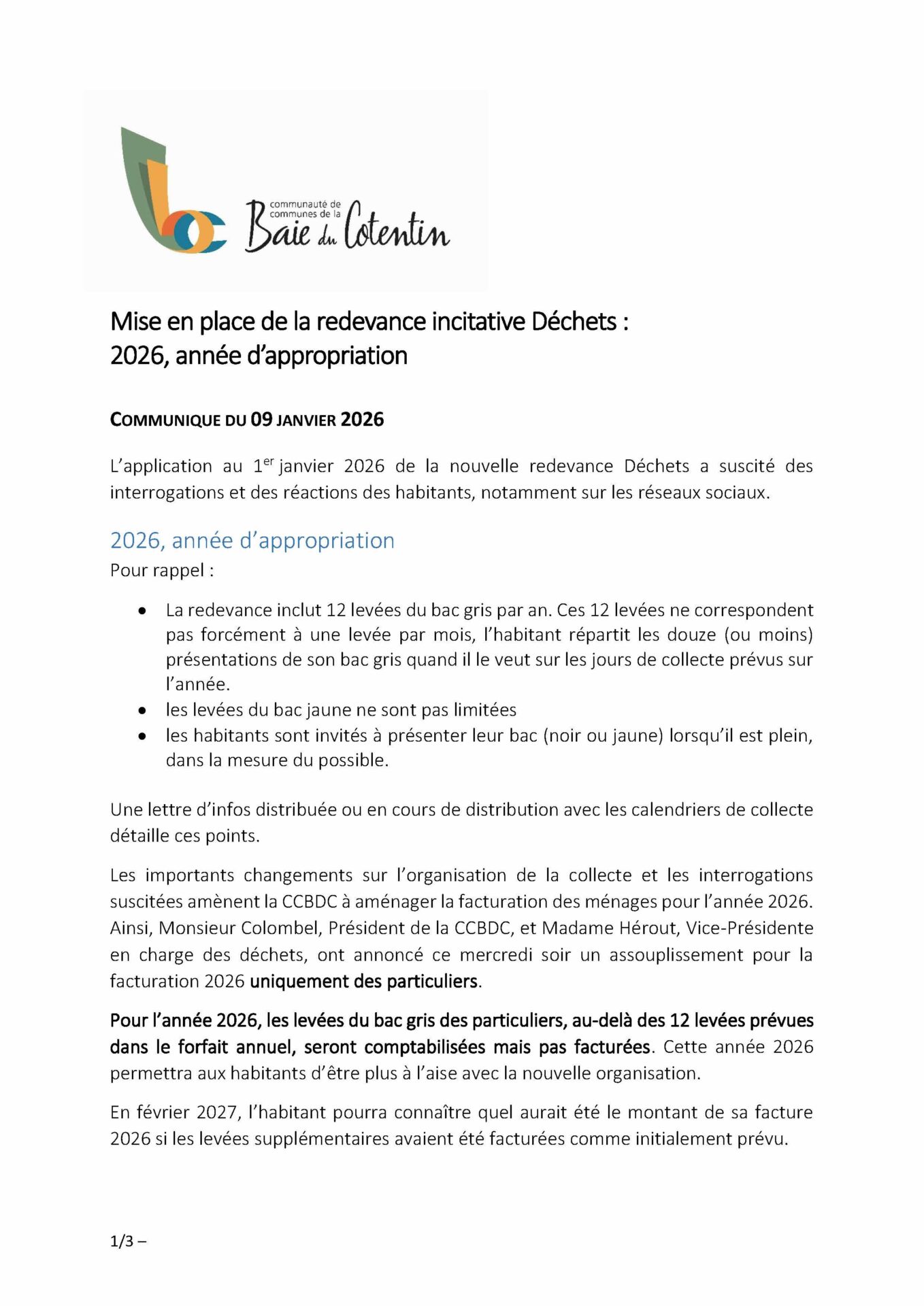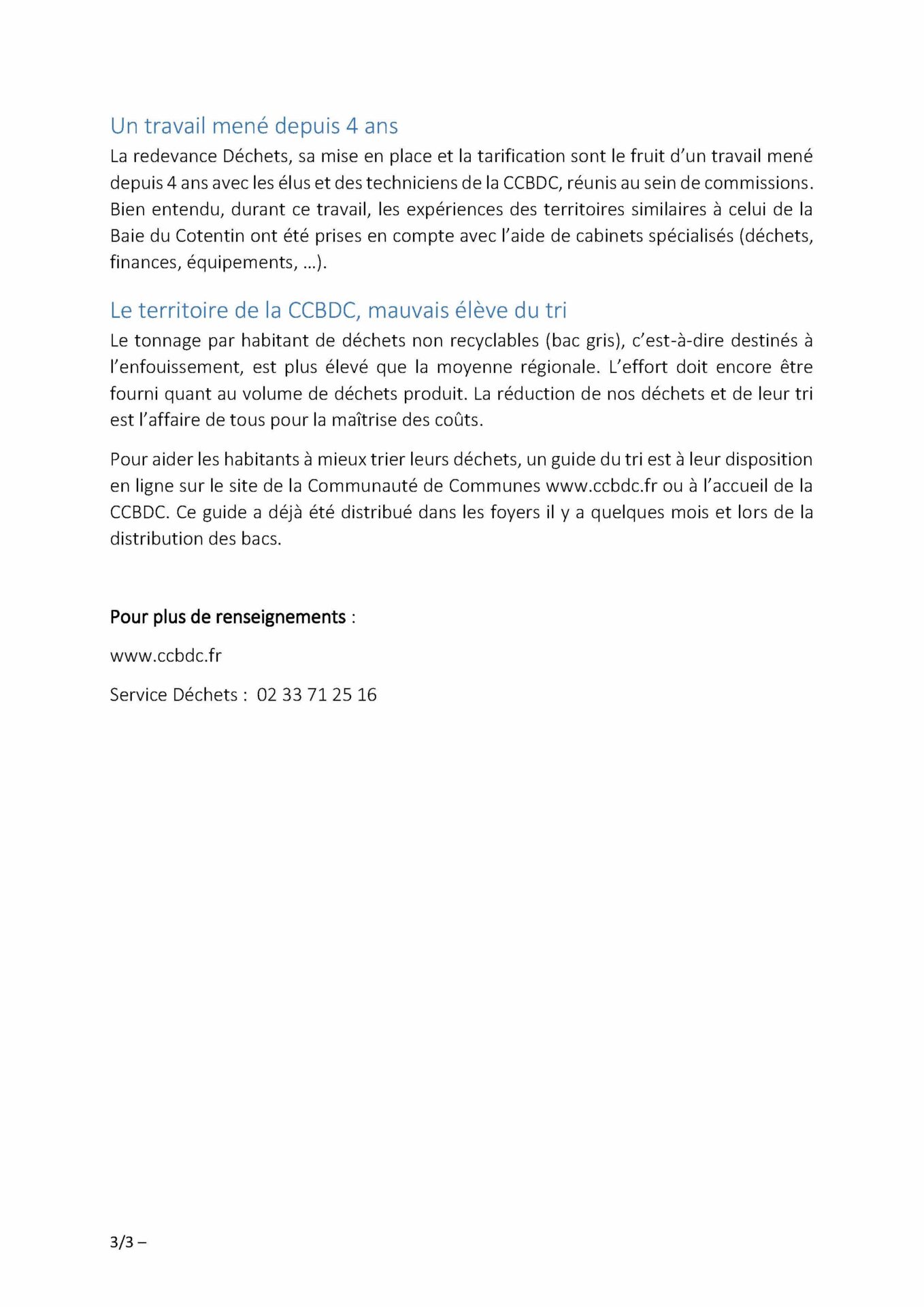 Début janvier 2026, vous trouverez dans votre boîte aux lettres le nouveau numéro de « Bien trier en Baie du Cotentin » qui présente les nouveaux services mis en place avec la Redevance Déchets.